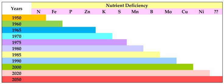 Appearance of nitrogen and micronutrient deficiencies in cultivable land in India.